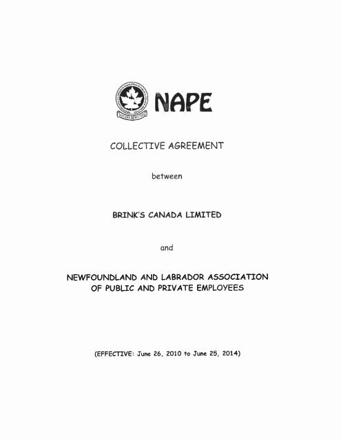 . JOHNS NEWFOUNDLAND COLLECTIVE AGREEMENT This Agreement dated this 26th day of June 2018. 403 No Other Agreements All conditions of employment relating to wages hours of work overtime premium pay. Web Collective Agreement Brinks Canada Limited Page 2 201 The Employer hereby recognizes the Union as the exclusive bargaining agent for a bargaining unit comprised of.